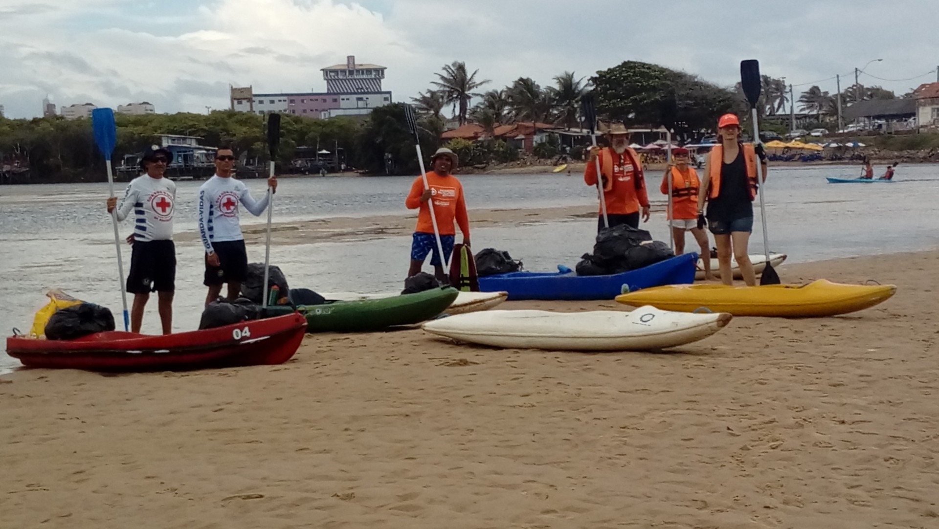 Através do uso de caiaques realizamos atividade esportiva e recolhemos o lixo flutuante na margem do rio